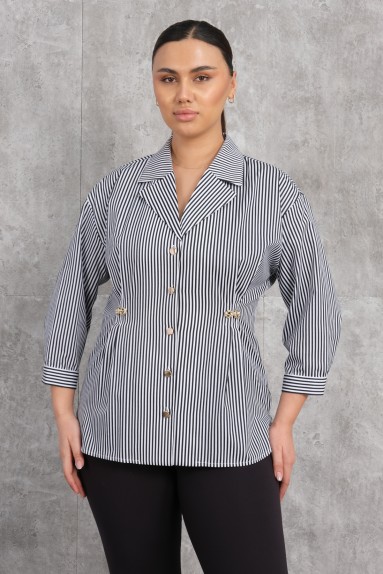 بلوزة نسائية ذات مقاس كبير مصنوعة من قماش الأورجانزا الأبيض الشفاف، تتميز بتفاصيل من الأمام والخلف. تحتوي على ياقة دائرية تحت طوق الجاكيت. سطح البلوزة مزين بنقوش زهرية وتحتوي على أكمام طويلة منتفخة. الجزء السفلي من البلوزة والأساور محكمة. القطعة الفضفاضة من البلوزة تغطي معالم الجسم برفق، مع توفير أناقة ورقي.