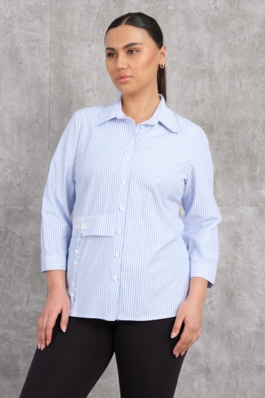 هذه القميص مصممة للنساء ذات المقاسات الكبيرة وتتميز بأزرار إغلاق في الأمام. لونه أزرق وله أكمام طويلة. يمكن طي الأكمام باستخدام الأزرار الموجودة عليها. يوجد تطريزات صغيرة على الصدر والأجزاء الجانبية. القميص مريح وأنيق في نفس الوقت.