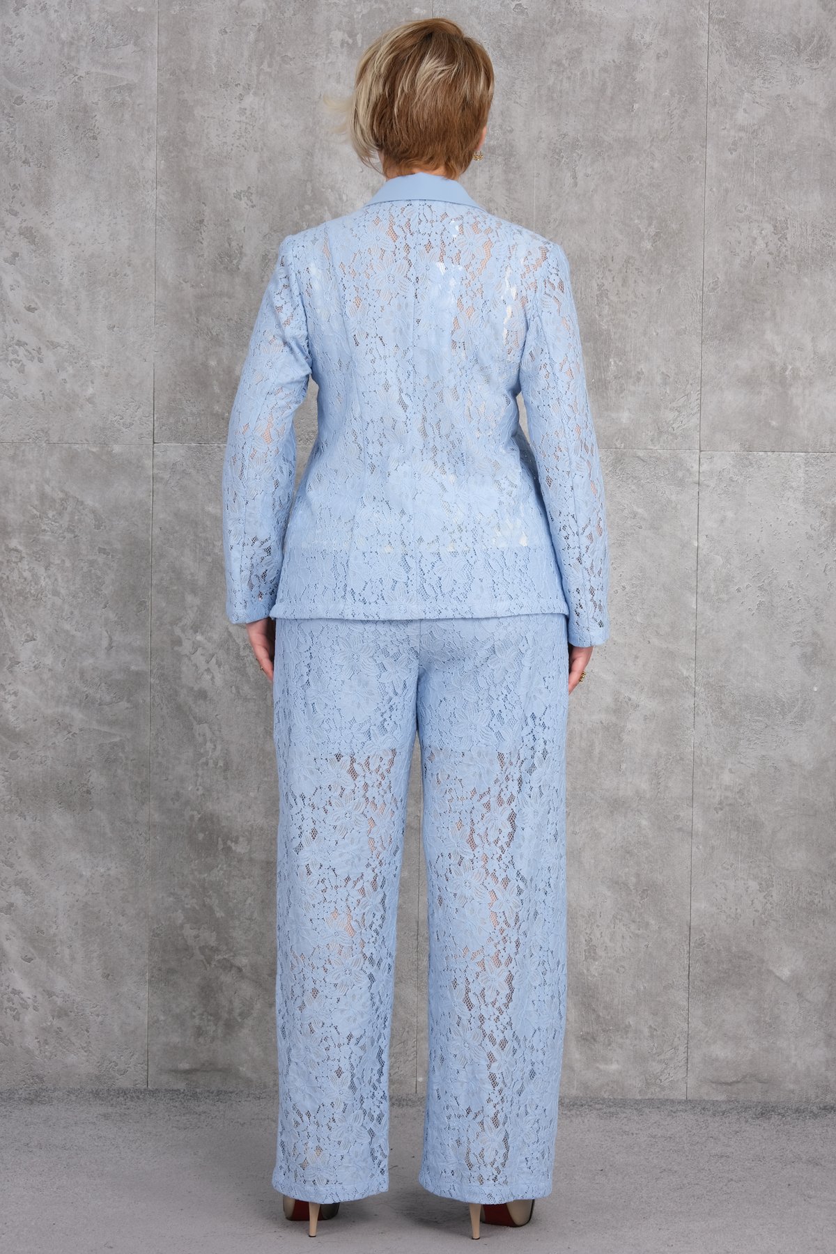 يقدم هذا الطقم النسائي الكبير الحجم مزيجًا أنيقًا وأنيقًا باللون الأزرق الفاتح. يتميز الجاكيت بأكمام طويلة وياقة، مصمم بإغلاق أمامي بالأزرار. جيوب الجاكيت مغطاة بغطاء. الجاكيت والسروال مزينان بتفاصيل دانتيل دقيقة. السروال يتميز بقصة مريحة وينتهي بأرجل واسعة عند الكاحلين. هذه المجموعة مثالية للنساء اللواتي يرغبن في الجمع بين الأناقة والراحة.