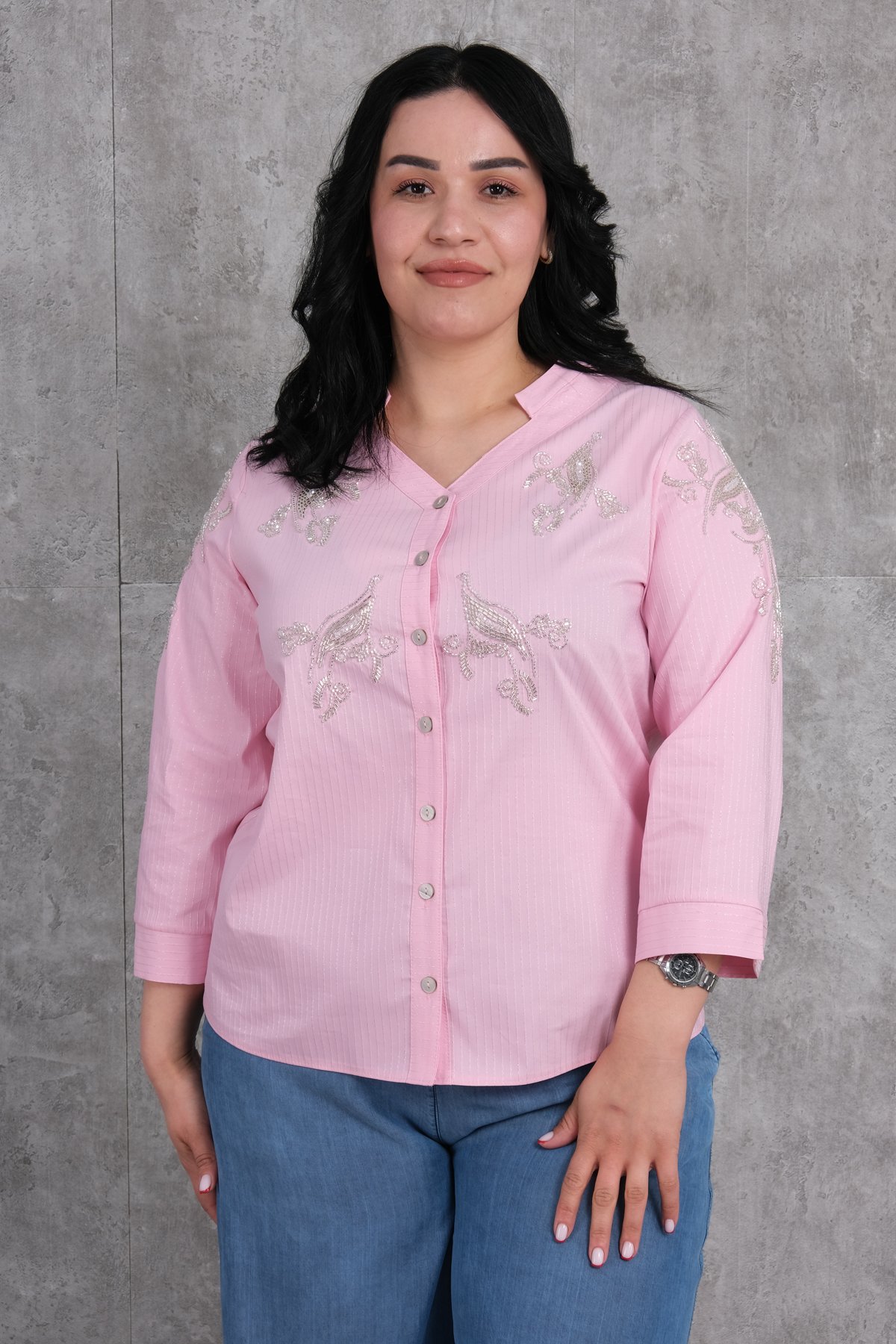 يتميز هذا القميص النسائي بالحجم الكبير بتصميم أنيق وعصري. القميص الوردي ملفت للنظر بتطريزاته الفضية. يتميز بأكمام طويلة وياقة على شكل حرف V، مع أزرار في الجهة الأمامية. ويتميز الجزء الخلفي بمظهر بسيط ونظيف. هذا القميص مثالي للاستخدام اليومي وأيضًا للمناسبات الخاصة. بفضل قصه المريح، يمكن للنساء من الحجم الكبير ارتداء هذا القميص بشكل مريح، وهو مصنوع من قماش القطن الصحي والقابل للتنفس.