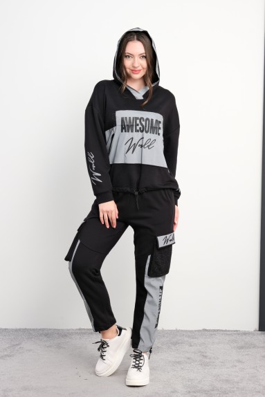 This product is a small-sized womens sports two-piece set. The black-colored set consists of a long-sleeved, hooded top and a comfortable, loose-fit pants. The top features shiny, attention-grabbing details. There are silver-colored bands on the sleeve ends and hood strip. Energetic and colorful prints are found on the front. The bottom is designed in harmony, with various colorful prints on the front of the pants. The pants have elastic cuffs, providing ease during sports or daily use. The set is made from a blend of cotton and polyester, offering comfort and flexibility.