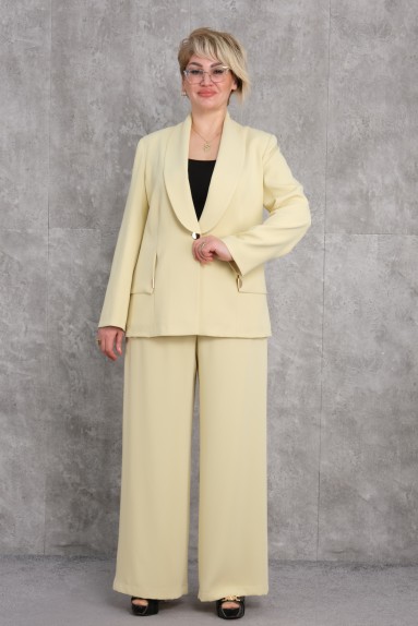 This plus-size womens two-piece suit offers a stylish and comfortable look. The top features a single-button design with a classic pointed collar. There are stripe details on the outer side of the sleeves. The trousers are straight cut, with an elastic waist and also have stripe details on the sides. A modern blue tone is chosen for the color. The fabric is high-quality, durable, and comfortable. It can be easily preferred for daily use or in a work environment.
