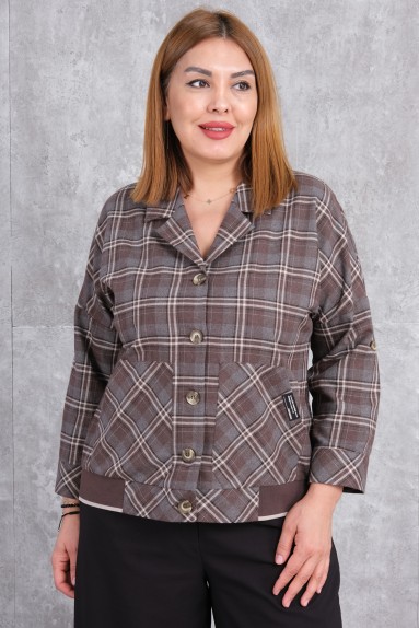 This plus-size womens jacket stands out with its elegant purple color and is ideal for wearing in cool weather. Its soft cotton fabric provides comfortable wear. The jacket features a button closure at the front, with striped details at the bottom and cuffs. It combines elegance and comfort with its wide collar and simple design.