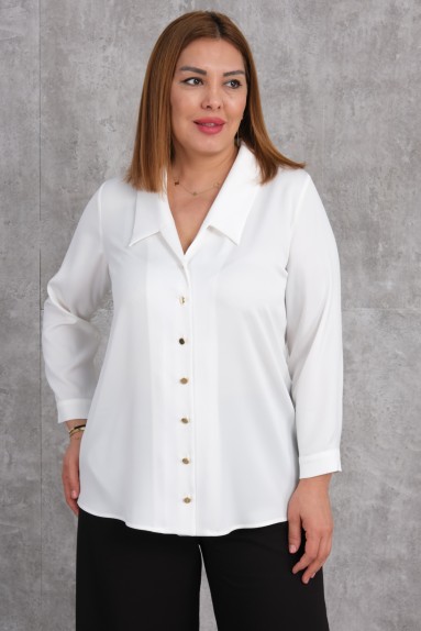 This plus-size womens blouse offers a combination of comfort and elegance. It is white and made from a soft and stretchy fabric. The standout features are the flower detail and the ringed neckline on the front. The blouse has half sleeves and a round neckline, making it perfect for everyday wear. The back is plain and simple, allowing for freedom of movement. The cut of the blouse elegantly accentuates the bodys curves, making it both stylish and comfortable.