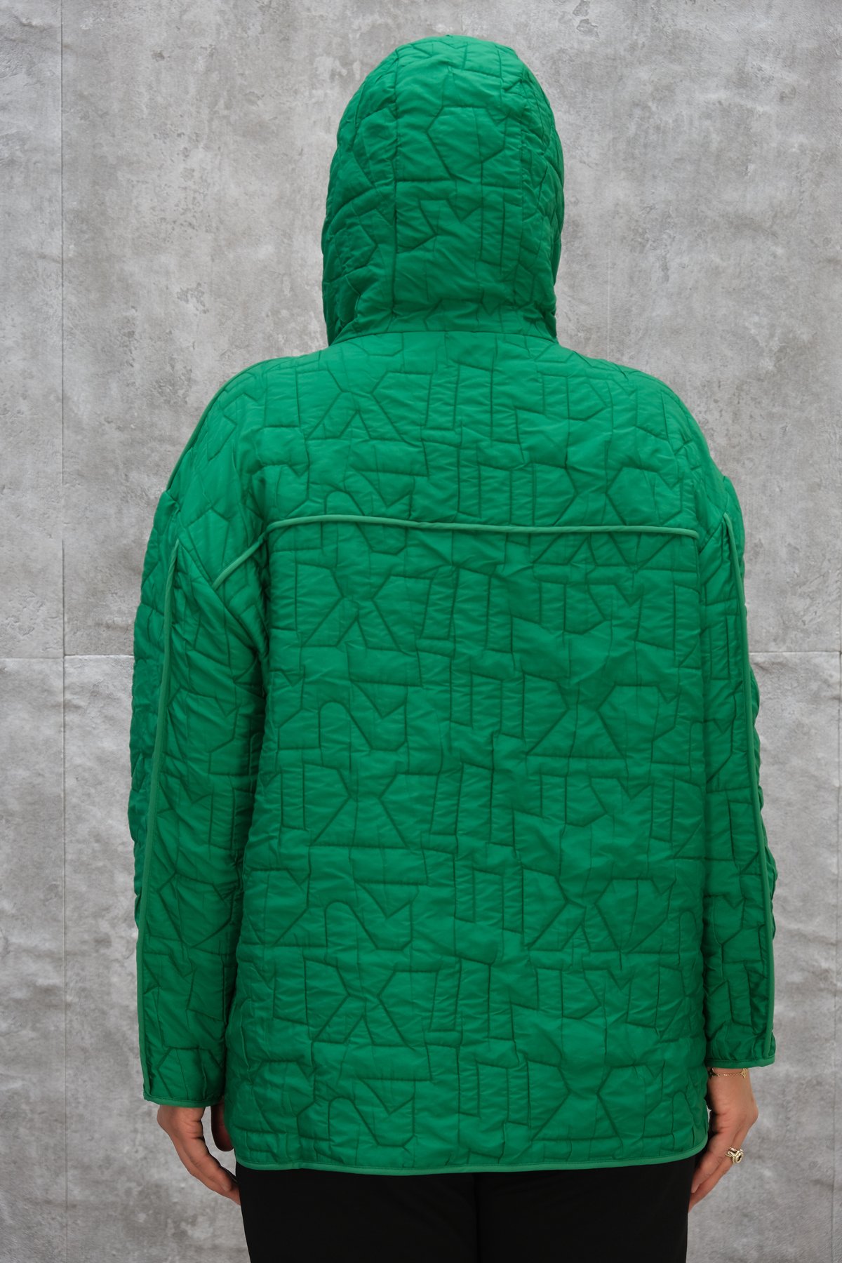 This plus-size green short sports jacket for women is noted for its lightweight and comfortable fabric. It features a front zipper closure and two side pockets for practical use. The hooded design provides protection in cold weather, and the textured fabric adds a stylish look to the jacket.