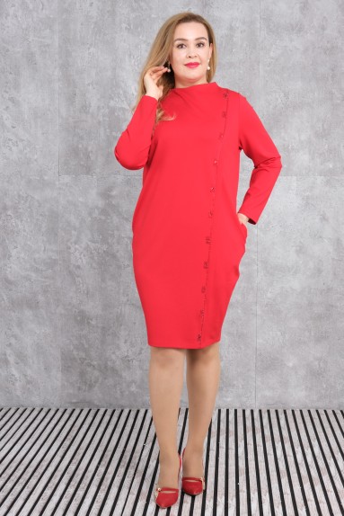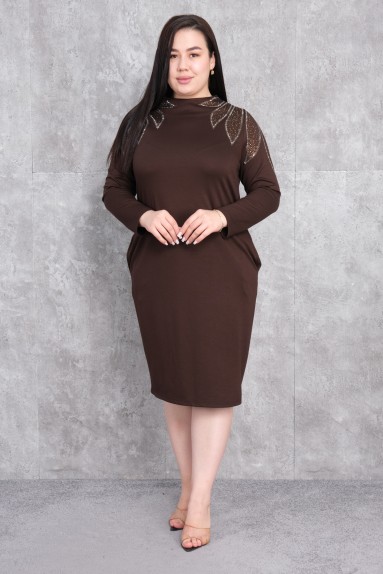 This dress is a modern and elegant outfit designed for plus-size women. It is in black color with long sleeves and ends at knee length. The front part of the dress features transparent lace details and a small brooch. It has a zipper closure at the back for practical use. The soft and stretchy fabric provides a comfortable wear, suitable for both special occasions and everyday use.