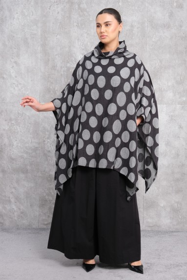 This plus-size womens poncho offers an elegant and comfortable style. Its design, which stands out with large blue polka dots on a black background, creates a modern look with its asymmetrical cut and wide sleeve details. Thanks to its soft and lightweight fabric, it can be comfortably worn in the autumn and winter months. The poncho features a removable button detail at the neck area. There are laces on the edges of the sleeves, which add an elegant touch to the product. The breathable nature of the fabric also increases comfort.