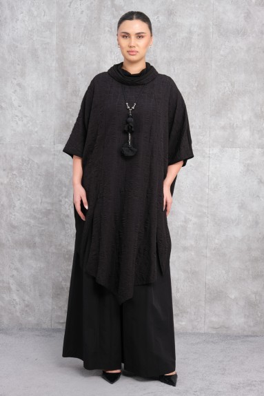 This womens dress features a modern and stylish design. The front of the dress showcases a combination of large black and beige colors in a harmonious pattern. The top part is loose-fitting, transitioning into a slightly narrowing structure at the bottom. The dress is long, extending down to the ankle. It has long sleeves that end at the wrist. At the back, it includes a small slit detail which ensures comfortable wear. Made from soft and high-quality fabric, it is not only comfortable but also elegant.