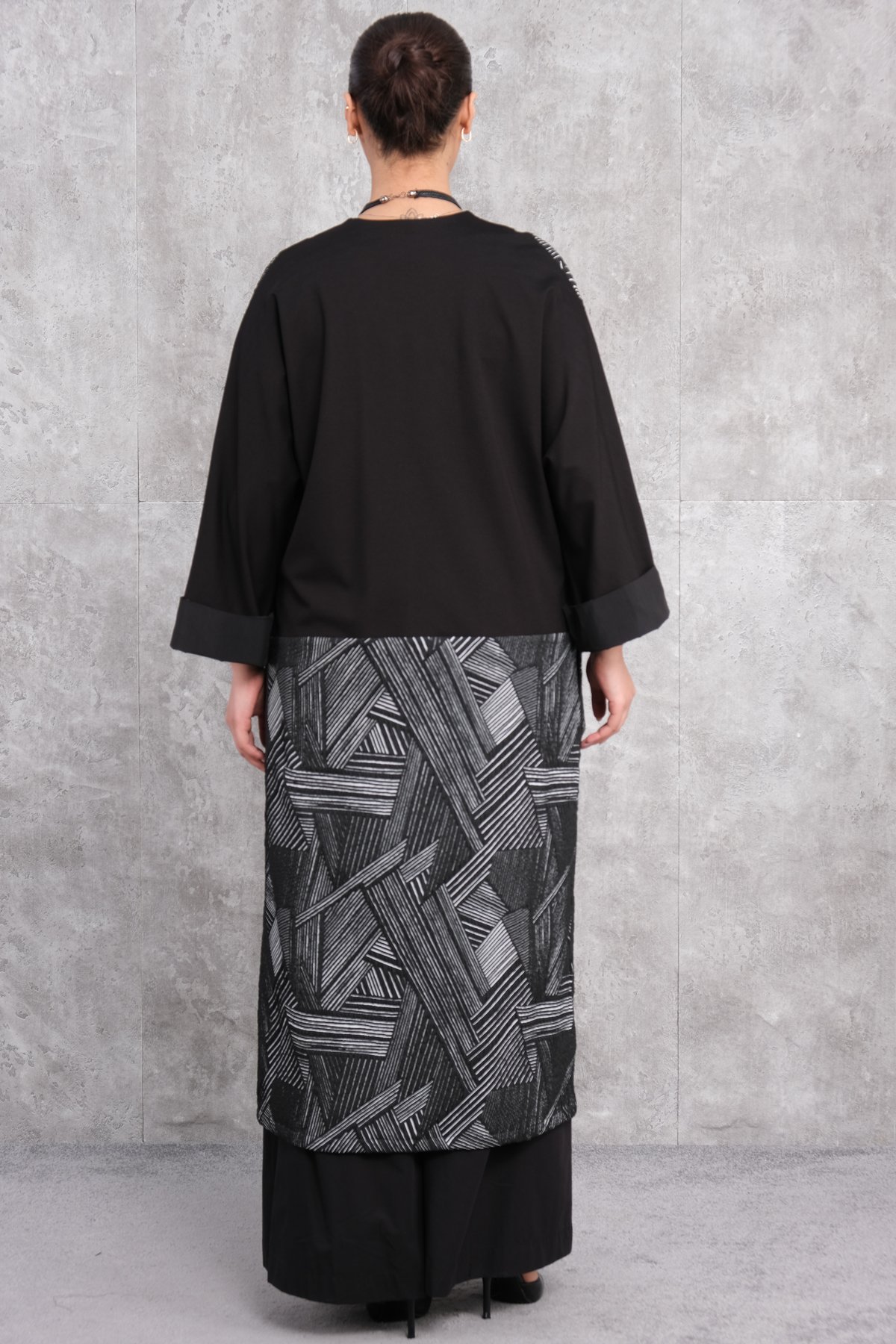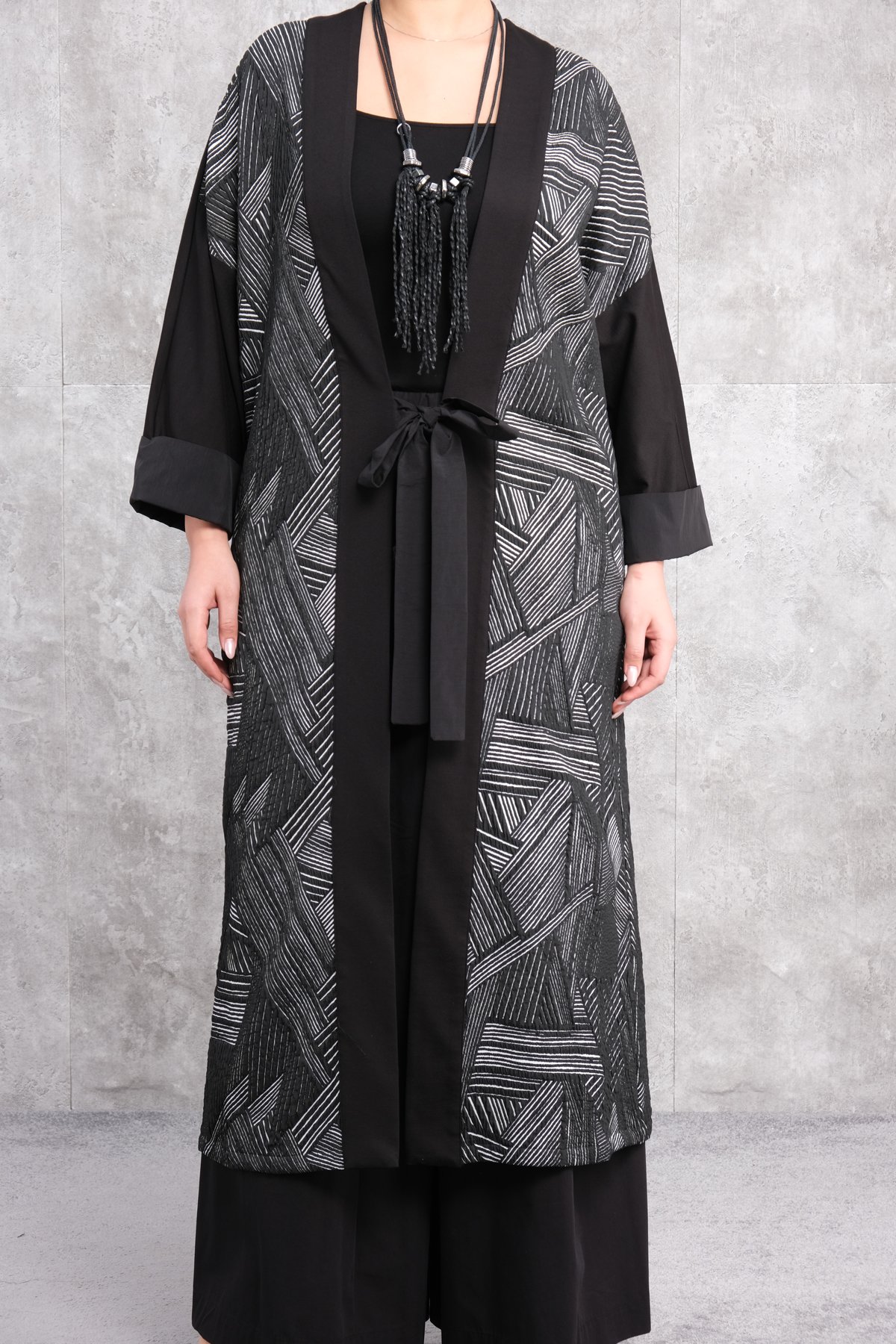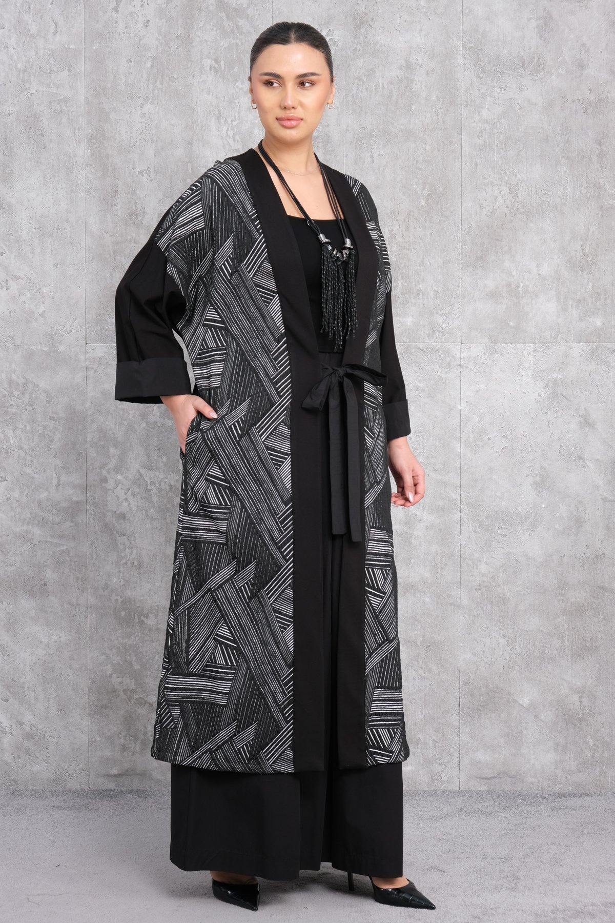 This product is a plus-size womens caftan designed specifically for larger sizes. Featuring a predominantly black background adorned with white geometric patterns, the caftan offers an elegant and chic appearance. The garments wide cut ensures a comfortable fit. It has long sleeves with wide and comfortable cuffs. The front section includes a belt detail that can be tied at the waist, allowing the caftan to be adjusted to fit different body shapes. The front is entirely open, adding a stylish layer to any outfit and helping the wearer highlight their style. The back is plain black with the geometric patterns continuing on the lower section.