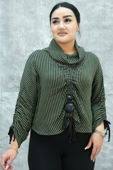 This dark brown womens blouse is made from a cotton blend fabric. It features a high collar and 3/4 length sleeves, providing a modern and elegant look. The front has criss-cross cut details, and the back features knot-like details. Its relaxed fit makes it suitable for everyday and work wear, offering simplicity and elegance with its minimalist design.
