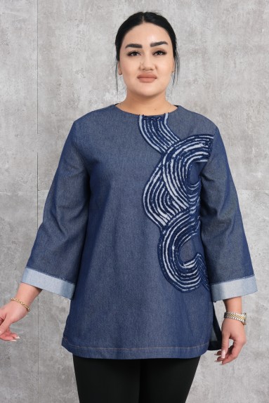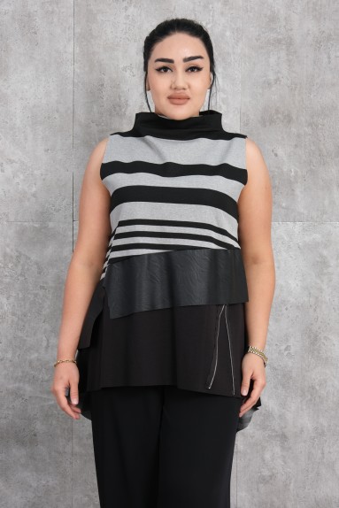 This plus-size womens tunic is black, hooded, and made from a soft and comfortable fabric. It has drawstring details on the front. The semi-loose fit offers ease of movement and it features long sleeves.