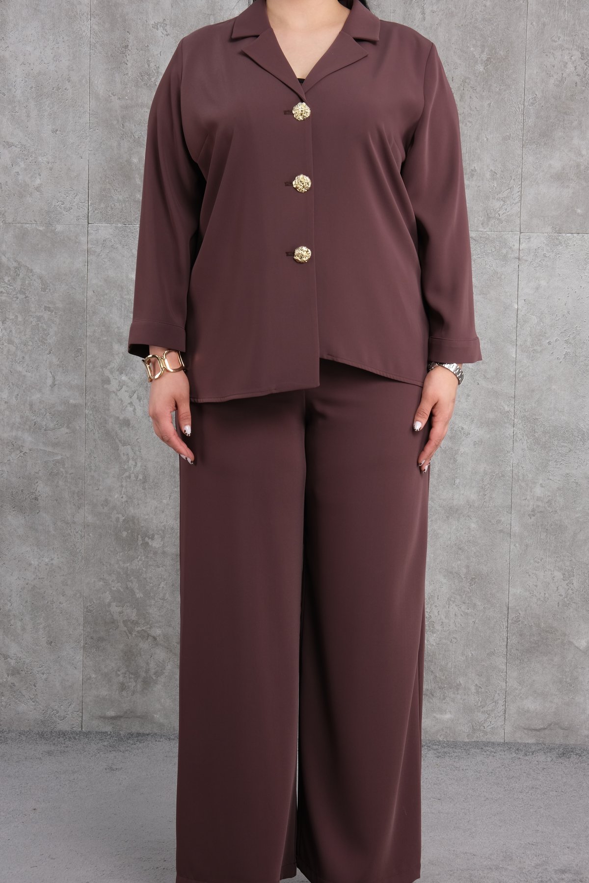 This product is a plus-size womens two-piece suit. The suit combines comfort and elegance. The top part has long sleeves and a front button design. The buttons are in gold color, adding a touch of elegance to the outfit. The collar of the top is wide, giving it a classic jacket appearance. The bottom part is designed as wide-legged and comfortable trousers. The trousers have an elastic waistband for ease of movement. The fabric color is brown and is made from high-quality, durable material.