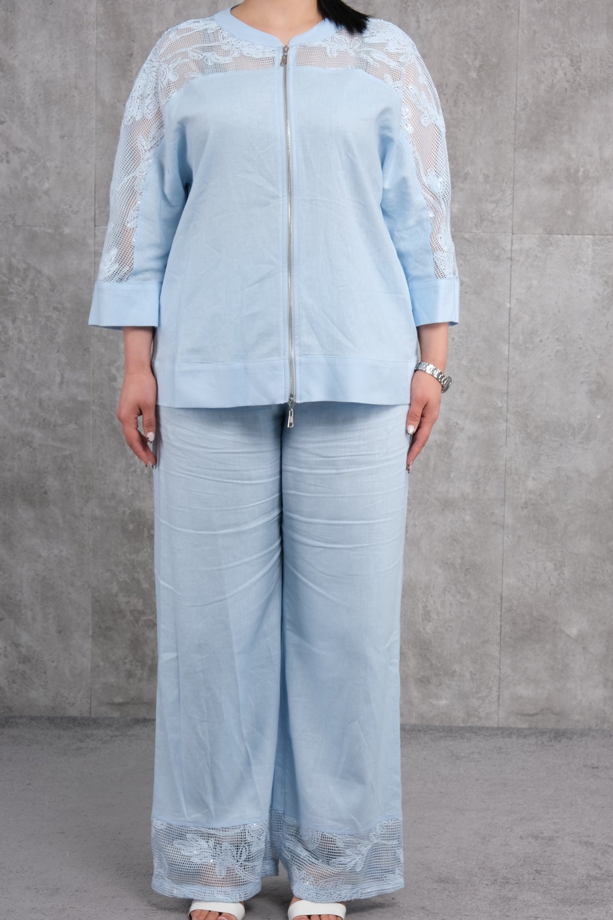 This product is a stylish and comfortable two-piece set designed for plus-size women. It features a fresh and modern look. The set consists of a jacket and pants, both in light blue and adorned with lace details. The jacket has a front zipper and lace details on the upper parts of the sleeves. The pants have a relaxed fit, with lace embroidery at the bottom of the legs. It is an ideal choice for both casual wear and special occasions. The product is made from breathable and lightweight fabric, making it comfortable to wear during the summer months.