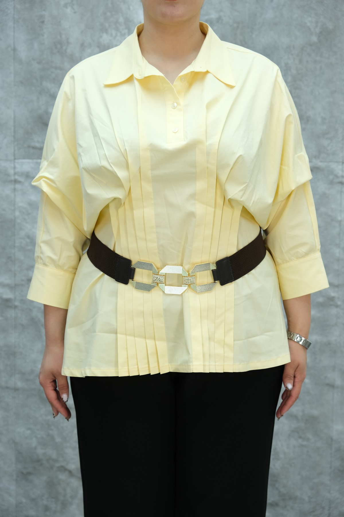 This plus-size womens blouse is light yellow in color, featuring a V-neck and short sleeves. The front of the blouse has pleated details and is complemented by a black belt at the waist. The back is designed with a simple, clean look. The blouse is made of lightweight and breathable fabric, making it especially comfortable to wear during the summer months. Its soft texture and flowing design offer both elegance and comfort to the wearer.