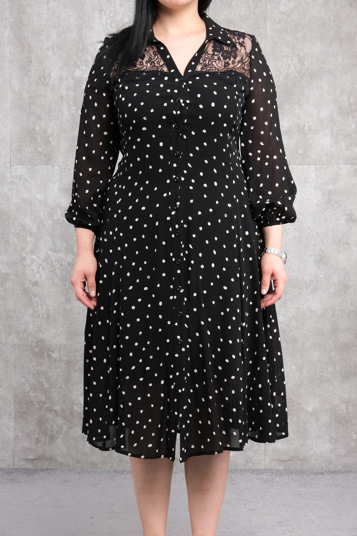 Это платье украшено белыми горошинами на черной основе. Верхняя часть имеет черные кружевные детали. Вырез платья V-образный, длинные рукава. Рукава и подол собраны, подчёркивая комфортную и свободную посадку без ремня. Подходит для повседневной носки, предназначено для женщин больших размеров.