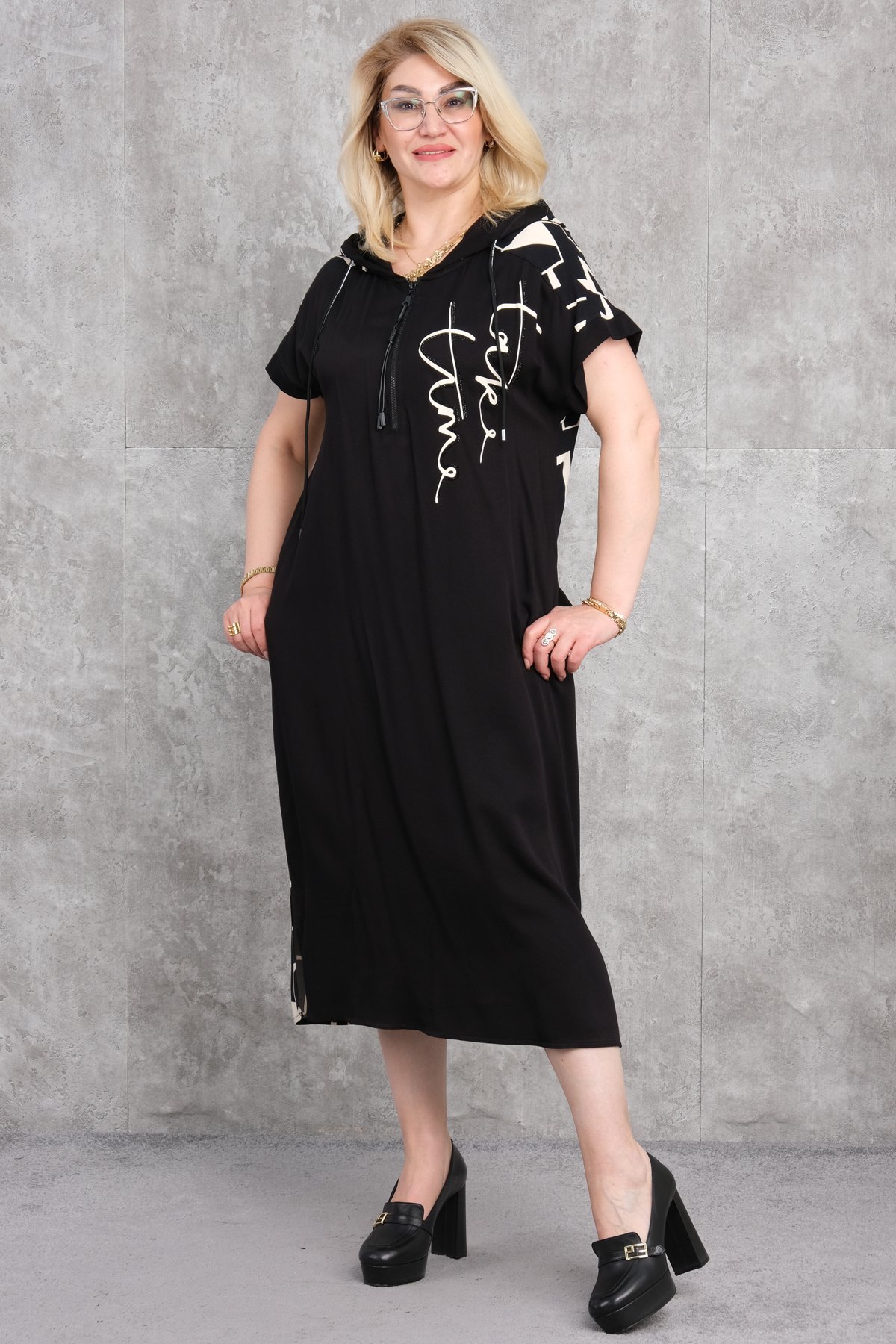 Это платье для спорта для женщин больших размеров сочетает в себе элегантность и комфорт. На передней части черного цвета с современными графическими дизайнами. Дизайн с капюшоном добавляет спортивный вид, с короткими рукавами и длиной ниже колена. Задняя часть украшена геометрическими узорами, предлагая два разных образа. Его мягкая и эластичная ткань обеспечивает комфорт в течение всего дня. Подходит как для повседневной носки, так и для спортивных занятий.