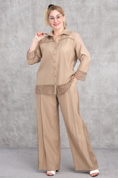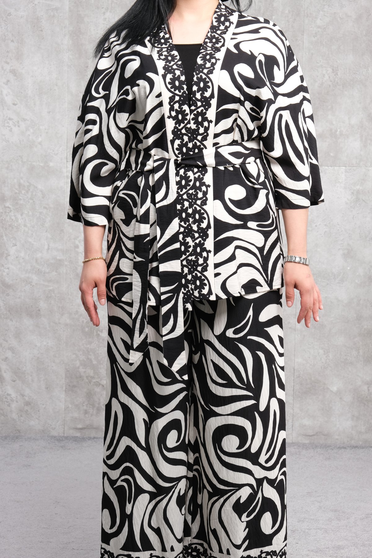 Этот продукт представляет собой стильный комплект для женщин больших размеров. Комплект украшен привлекающим внимание узором в черных и белых тонах. Верхняя часть представляет собой жакет с широким воротником и узорчатой полосой спереди. Рукава три четверти длиной и имеют свободный крой. Нижняя часть состоит из брюк с широкими штанинами и узорчатыми полосами по краям. Жакет поставляется с поясом, который можно использовать для акцентирования талии. Комплект изготовлен из легкой ткани, что обеспечивает комфортное ношение, и подходит как для повседневных, так и для особых случаев.