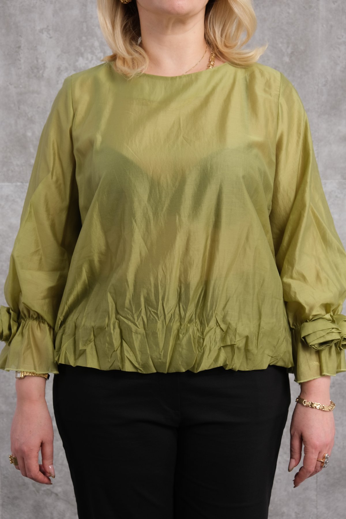 Эта блузка специально разработана для женщин больших размеров и имеет современный стиль. Блузка, выделяющаяся своим оливково-зеленым цветом, сделана из легкой и комфортной ткани. Имеет круглый вырез и длинные рукава. Детальные цветочные декорации на рукавах придают блузке элегантный вид. Подол и рукава отделаны эластичными лентами. Благодаря своей прозрачной структуре, ее можно комбинировать с подходящим нижним бельем. Она может быть стильным выбором как для повседневного использования, так и для особых случаев.