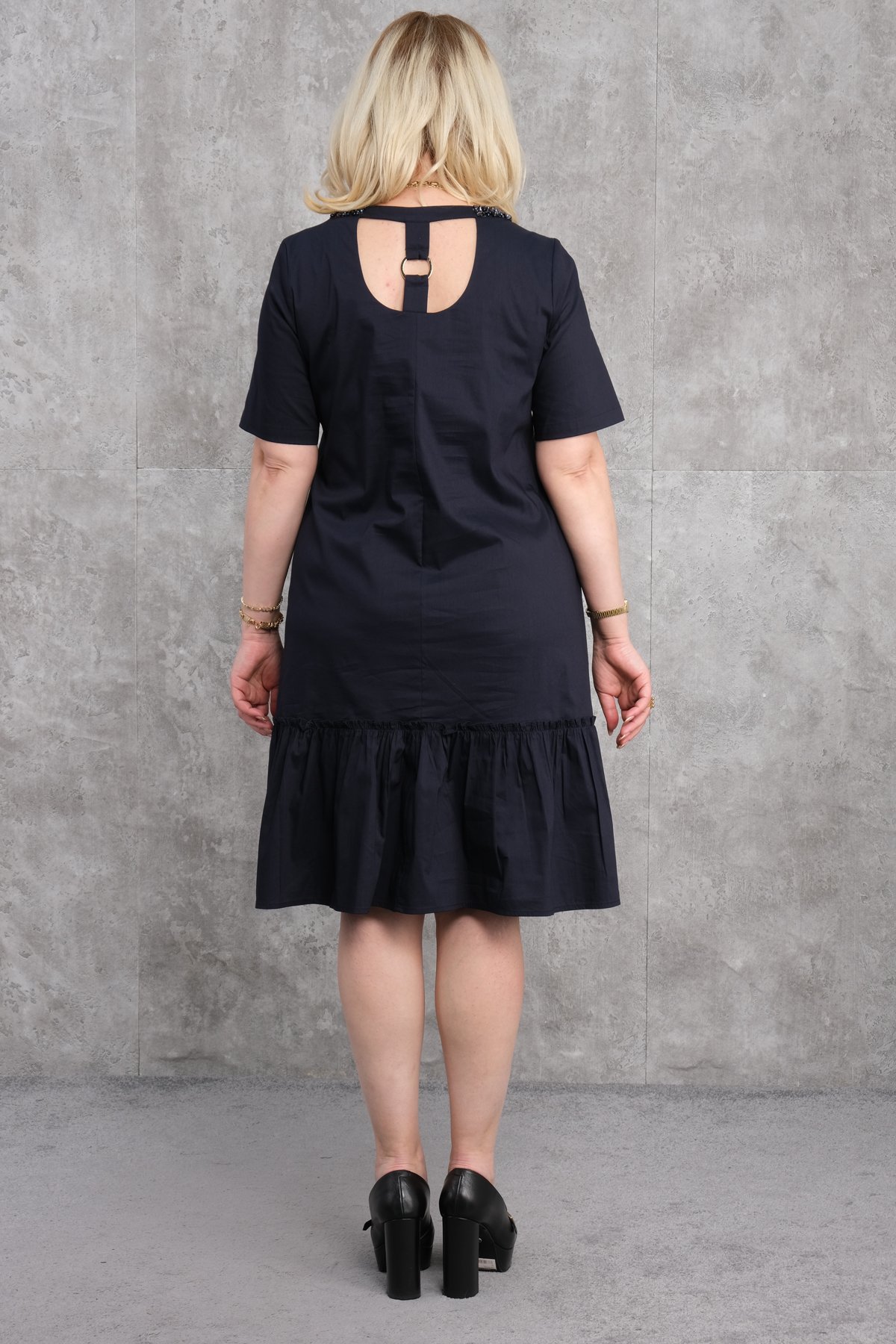 Это повседневное платье для женщин большого размера сочетает в себе элегантность и комфорт. Оно изготовлено из хлопковой ткани, которая мягкая и удобная в носке. Свободный крой позволяет легко двигаться и отлично смотрится на любой фигуре. Платье имеет оборчатый подол, который придает женственности. С короткими рукавами, оно подходит для повседневной носки. На спинке имеется детализированный вырез с кольцом. Платье темного цвета легко сочетать с любыми аксессуарами. Его можно носить как ежедневно, так и на особые случаи.