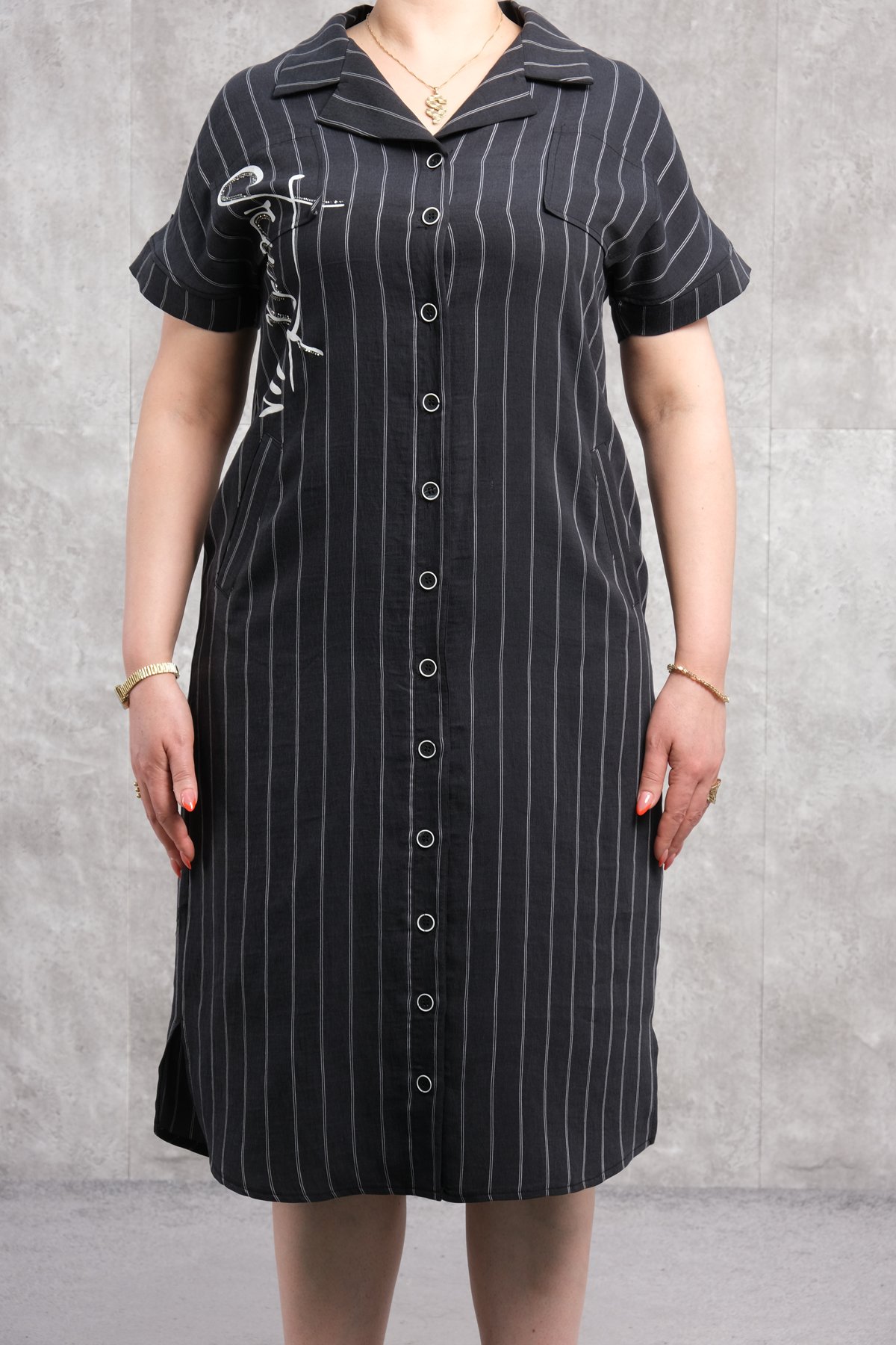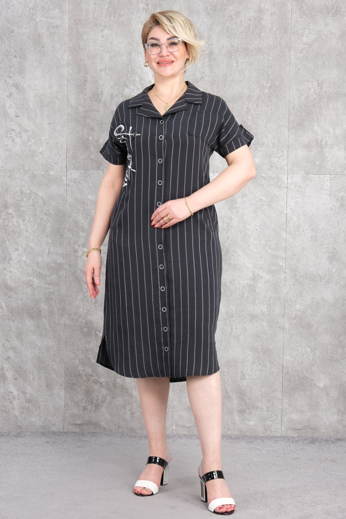 Это платье больших размеров для женщин предлагает комфортный и стильный вид. Платье имеет вертикальный узор в тонкую полоску и дизайн с застежкой на пуговицы впереди, обеспечивающий легкость движений. Платье с короткими рукавами и воротничком идеально подходит для повседневной носки. Детали с боковыми разрезами придают платью движение и стиль. Ткань высококачественная и удобная.