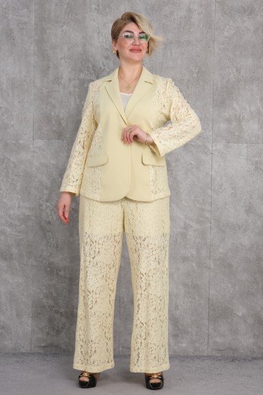 Этот женский костюм большого размера предлагает элегантное и стильное сочетание в светло-голубом цвете. Пиджак имеет длинные рукава и воротник, застегивается на пуговицы спереди. Карманы пиджака с клапанами. И пиджак, и брюки украшены тонкими кружевными деталями. Брюки имеют удобный крой и заканчиваются широкими штанинами на щиколотках. Этот наряд идеален для женщин, которые хотят сочетать элегантность и комфорт.