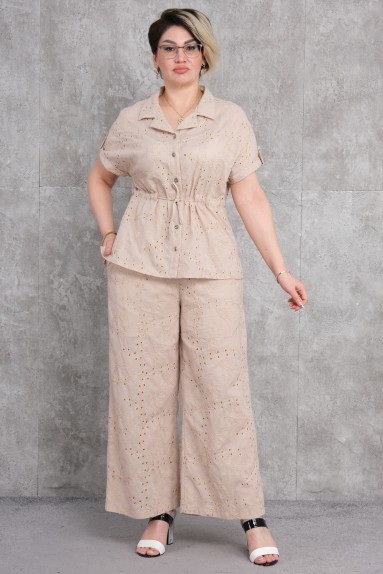 Этот продукт представляет собой стильный и удобный комплект для женщин большого размера. Набор выполнен в темно-синем цвете и удобно сидит на теле. Верхняя часть имеет перекрещивающуюся деталь на груди, добавляя динамичный акцент. Застегивается на три пуговицы, верхняя часть создает свободный и элегантный вид. С длинными рукавами, продукт идеально подходит для переходных сезонов. Брюки широкие и с высокой талией, обеспечивая как комфорт, так и элегантность. Ткань эластичная и легкая, что гарантирует комфорт в течение всего дня.