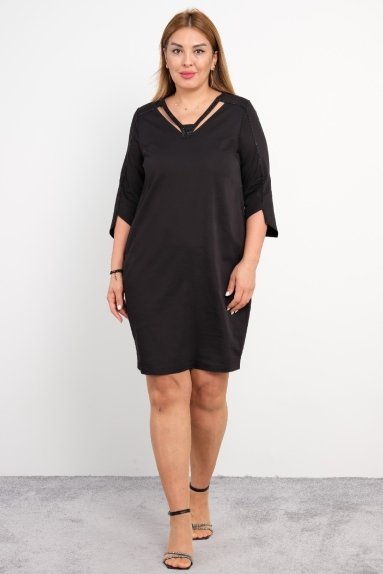 هذه الفستان هو فستان سهرة للنساء ذات الأحجام الكبيرة، مصمم خصيصًا ليناسب النساء ذوات القوام الممتلئ. الفستان باللون الأسود ويعبر عن الأناقة والرقي. على الرغم من تصميمه بدون أكمام، فإن الأكمام مزينة بتفاصيل من الريش، مما يمنحه مظهراً لافتاً. لديه قطع مستقيم وينتهي عند طول الركبة، مما يوفر اريحية في اللبس. الجزء العلوي من الفستان بسيط الشكل، مع قطع صغير في الخلف عند الرقبة.
