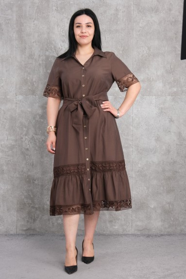 هذا الفستان النسائي بالحجم الكبير مصمم بلون أزرق أنيق. يتميز الفستان بتفاصيل دانتيل على الصدر والحافة. الياقة هي ياقة قميص كلاسيكية وتحتوي على إغلاق بأزرار. الفستان بأكمام طويلة والأكمام والجزء العلوي من الصدر مصنوعان من قماش الشيفون. يوجد حزام مع مشبك زخرفي عند الخصر. الجزء السفلي من الفستان مطوي، مما يضفي مظهراً حيوياً. هو اختيار مثالي للاستخدام اليومي والمناسبات الخاصة.