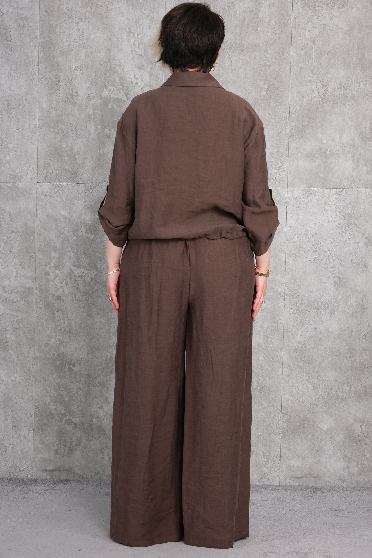 هذا المنتج هو طقم نسائي مقاس كبير مكون من قطعتين. الجزء العلوي يتميز بتفاصيل الأزرار وله أكمام طويلة. الأكمام تحتوي على أساور بأزرار ويمكن ثنيها بسهولة عند الحاجة. الجزء السفلي يتميز بأرجل واسعة مع تفاصيل الأزرار على جانبي الأرجل. القماش مصنوع من القطن، مما يوفر ارتداءً مريحًا للغاية.