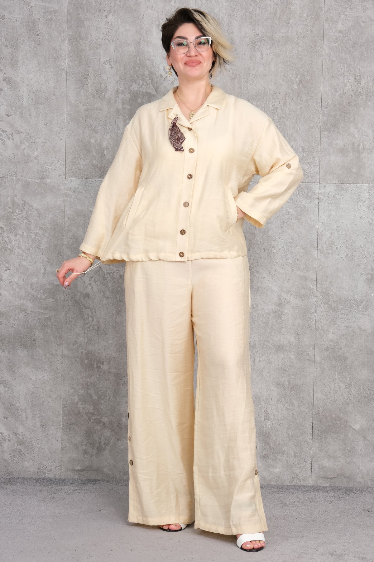 يقدم هذا الطقم النسائي الكبير الحجم مظهراً مريحاً وأنيقاً بفضل تركيبة عملية. الجزء العلوي يتمتع بياقة وأكمام طويلة، مزيناً بأزرار في الأسفل. كما يحتوي على تفاصيل أزرار على الأكمام، مما يضيف لمسة من الرقي إلى البساطة. البنطلون يتميز بقصته الواسعة ويوفر ارتداءً مريحاً. اللون الكريمي يجعله مناسباً لكل من الصيف والشتاء. القماش ناعم وخفيف، مما يضمن الراحة طوال اليوم. يقدم هذا الطقم مجموعة متنوعة من الاستخدامات، من الارتداء اليومي إلى المناسبات الخاصة.