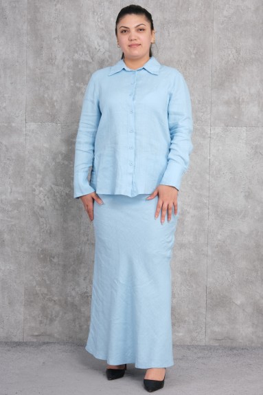 هذا المنتج هو مجموعة نسائية مكونة من قطعتين للمقاسات الكبيرة مريحة وأنيقة. تتكون المجموعة من قميص وتنورة طويلة. الجزء العلوي يتميز بأزرار وياقة، مع أكمام واسعة للراحة وسهولة الحركة. التنورة طويلة وواسعة القص، مما يوفر الأناقة والراحة. القماش ناعم وخفيف الوزن، مما يجعله مثالياً للأشهر الصيفية. يوفر مظهراً أنيقاً بلونه الأبيض.