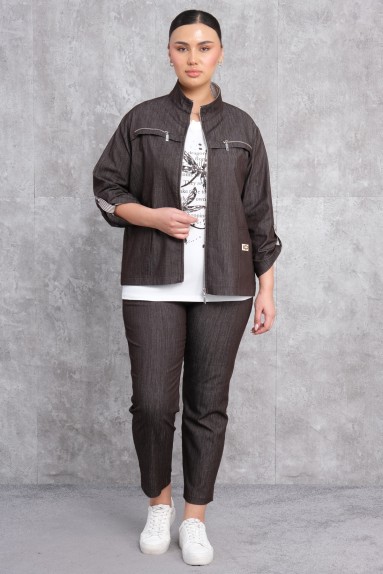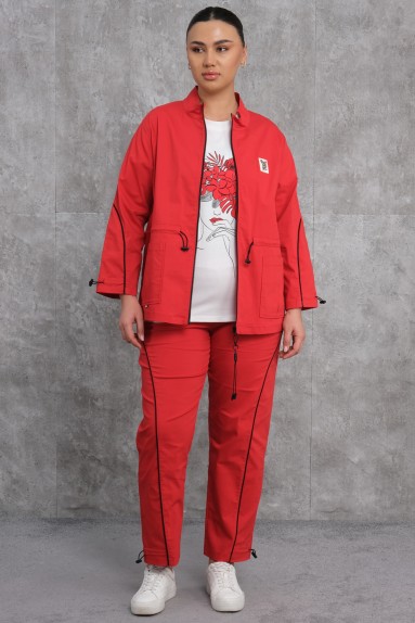 This Plus Size Womens Sports Three-Piece Set is ideal for women looking for a combination of comfort and style. The set is designed with loose cuts, enhancing freedom of movement during wear. The set includes three pieces: a long-sleeved jacket, a comfortable t-shirt, and wide-leg trousers. The jacket features button closure on the front and two large pockets. The jacket, t-shirt, and trousers are all made from soft and breathable fabric, making them comfortable even for extended wear. The product stands out with its striking orange color and is ideal for both sports activities and casual wear.