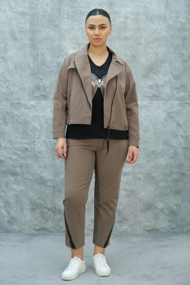 This product is a Plus Size Womens Sports Three-Piece Set specially designed for plus-size women. It features three pieces: a jacket, a blouse, and pants. The jacket is ideal for everyday use with its comfortable fit and lightweight fabric. It has a front zipper and two buttoned pockets at the waist. The blouse adds an aesthetic touch with floral patterns on it. The pants have a relaxed fit with pockets and button details on the legs. The entire set comes in matching beige tones, offering a combination of sporty and stylish elements.