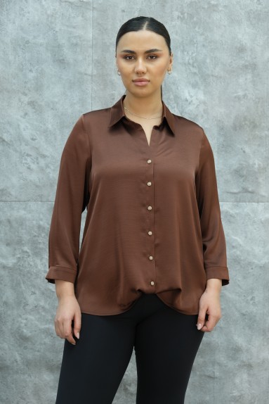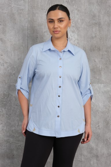 This plus-size womens shirt combines comfort and elegance. The product features a fine striped pattern on a white background. It has a classic collar and a button-down design. The sleeves are long and loose-fitting, providing easy movement. There are button details on both the front and back, adding a modern touch to the shirt. Made from soft cotton fabric, this shirt offers a gentle touch on the skin. It is ideal for both everyday wear and work environments. This shirt looks great when paired with leggings or jeans.