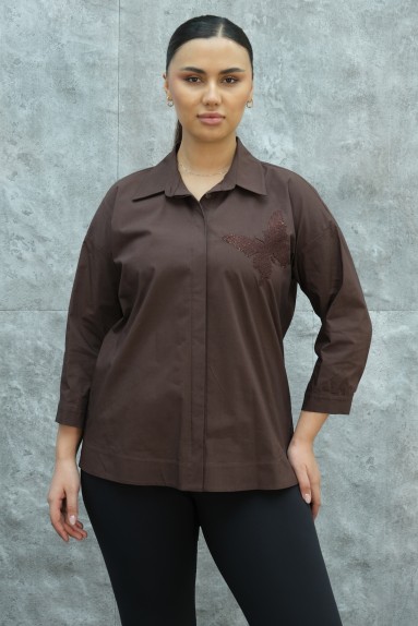 This shirt is designed for plus-size women and features button closure on the front. It is blue in color and has long sleeves. The sleeves can be rolled up using the buttons on them. There are small embroidery details on the chest and lateral parts. The shirt is not only comfortable but also stands out with its elegance.