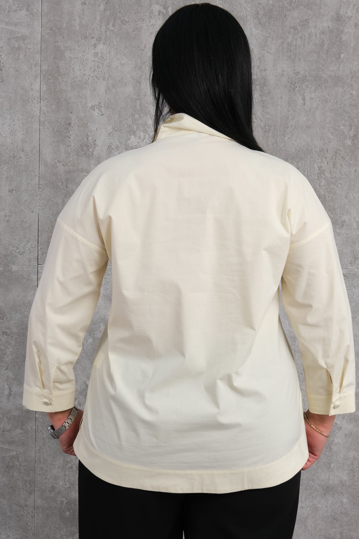 This product in the images is a plus-size womens shirt. The shirt is made from a light and comfortable fabric and has a beige color tone that is close to skin color. There is a buttoned closure feature on the front of the shirt. A delicate butterfly pattern is located on the left chest part of the shirt. The sleeves have cuff details and cover up to the elbows with a slight looseness. The back is plain without any patterns or decorations. The product has a relaxed fit, making it ideal for both casual and elegant use.