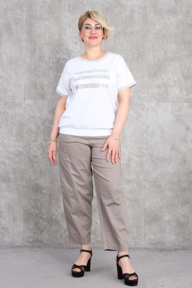This Plus Size Womens Two-Piece Set offers a modern and comfortable style. The top piece is black with stripe details on the front. The top is short-sleeved and has a round neckline, and it features stitching details. The bottom piece is light beige and is designed with a loose fit. The pant has an elastic waistband for comfortable wear. The set is made of 100% cotton, making it breathable and non-sweaty. It is ideal for daily use and stands out with its elegance.