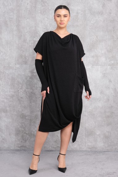 Это платье имеет удобный и современный стиль для женщин. Оно имеет среднюю длину, черного цвета, украшено серыми геометрическими узорами. Платье имеет воротник-хомут и длинные рукава, что делает его подходящим для повседневных и особых случаев. Изготовлено из смесовой ткани с хлопком, имеет геометрические узоры на передней части и те же узоры на манжетах. Сочетается с черными туфлями на высоком каблуке.