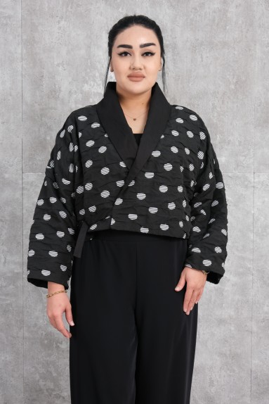 Этот жакет стильный и современный, идеально подходит для женщин. Он черный и изготовлен из мягкой ткани высокого качества. Жакет имеет перекрестный узор с вертикальными и горизонтальными линиями на левой стороне и светло-коричневую ленту, завязанную на талии. У него классический широкий воротник, прямой и удобный крой, длинные рукава. Подходит как для повседневной носки, так и для особых мероприятий.