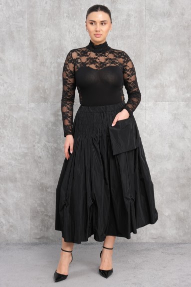 Этот продукт - женская юбка черного цвета с узором. Длина юбки ниже колена и имеет широкий крой. Ткань напоминает атлас или шелк. На юбке есть большие черные пятна в виде узора. Пояс эластичный, что облегчает ношение.