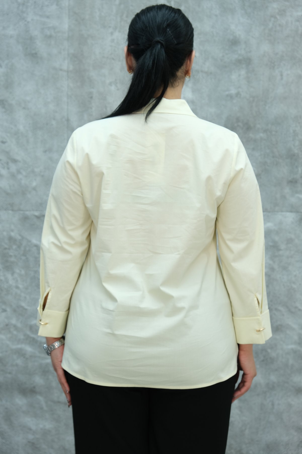 Этот продукт - блузка, разработанная для женщин большого размера. Доступны изображения спереди и сзади. Блузка элегантно и практично спроектирована. Она бежевого цвета и имеет длинные рукава. Спереди находится застежка на пуговицах, а воротник - классический рубашечный воротник. Свободный крой обеспечивает комфорт в течение всего дня. Изготовлена из легкой ткани, которая сохраняет прохладу, особенно в жаркую погоду. По бокам блузки разрезы, позволяющие свободу движений. Ее можно сочетать с различными нарядами и носить как в повседневной жизни, так и в деловой обстановке.