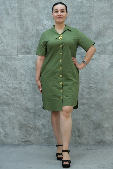 Этот женский платье большого размера выделяется своим простым и элегантным дизайном. Платье пастельно-зеленого цвета и украшено очень стильным и изящным цветочным узором на левом плече. На передней части платья расположены пуговицы, доходящие до V-образного выреза, что обеспечивает удобство использования. Это платье с коротким рукавом имеет длину до колена и свободный крой. Материал, использованный для изготовления платья, мягкий и эластичный, что делает его очень удобным для повседневного ношения. Это платье, сочетающее в себе элегантность и комфорт, можно носить в любое время года.