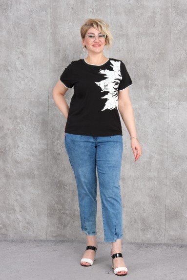Bu ürün, büyük beden kadınlar için tasarlanmış şık bir ikili takımdır. Üst parça, siyah beyaz yatay çizgili bir kısa kollu tişört olup, yuvarlak yaka detayıyla tamamlanmıştır. Düz kesim ve rahat bir yapıya sahiptir. Alt parça, siyah bir eteği içermektedir. Etek, diz boyunda olup beli kemerli ve önden düz kesimdir. Arka kısmında ise minimal detaylarla hareket kazandırılmıştır. Hem günlük kullanım için hem de ofis ortamı için uygun, rahat ve şıktır.