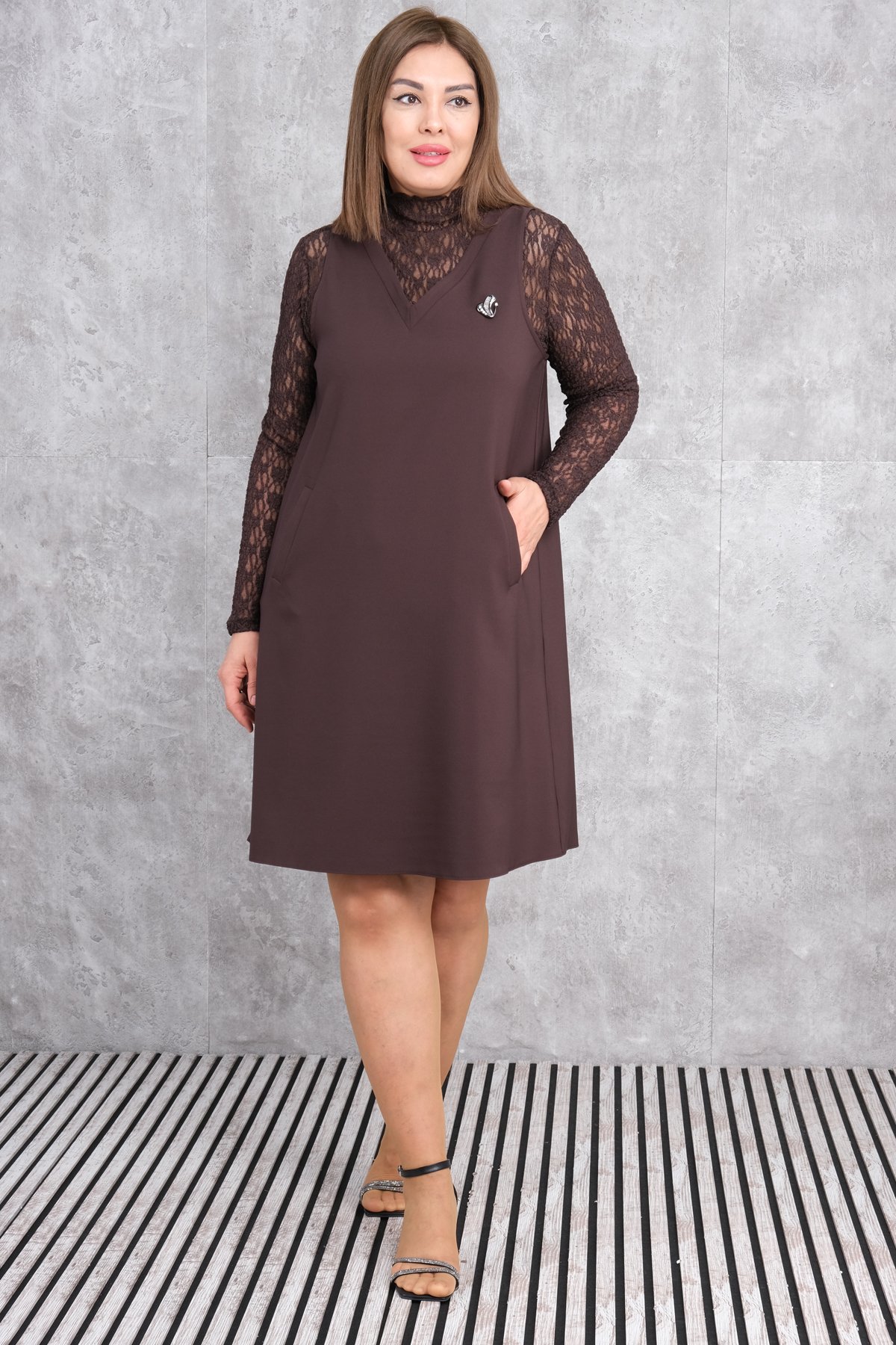 Bu büyük beden kadın elbisesi, koyu kahverengi renkte ve dantel uzun kollara sahiptir. Elbise, önde V yaka detayı ve küçük bir broş aksesuarı ile şık bir görünüm sunar. Elbisenin iki yanında cep detayları bulunur ve düz kesimi sayesinde rahat bir kullanım sağlar. Arka tarafı düz ve dantel kollara sahiptir. Diz hizasında biten elbise, rahat ve zarif bir görünüm sunar.